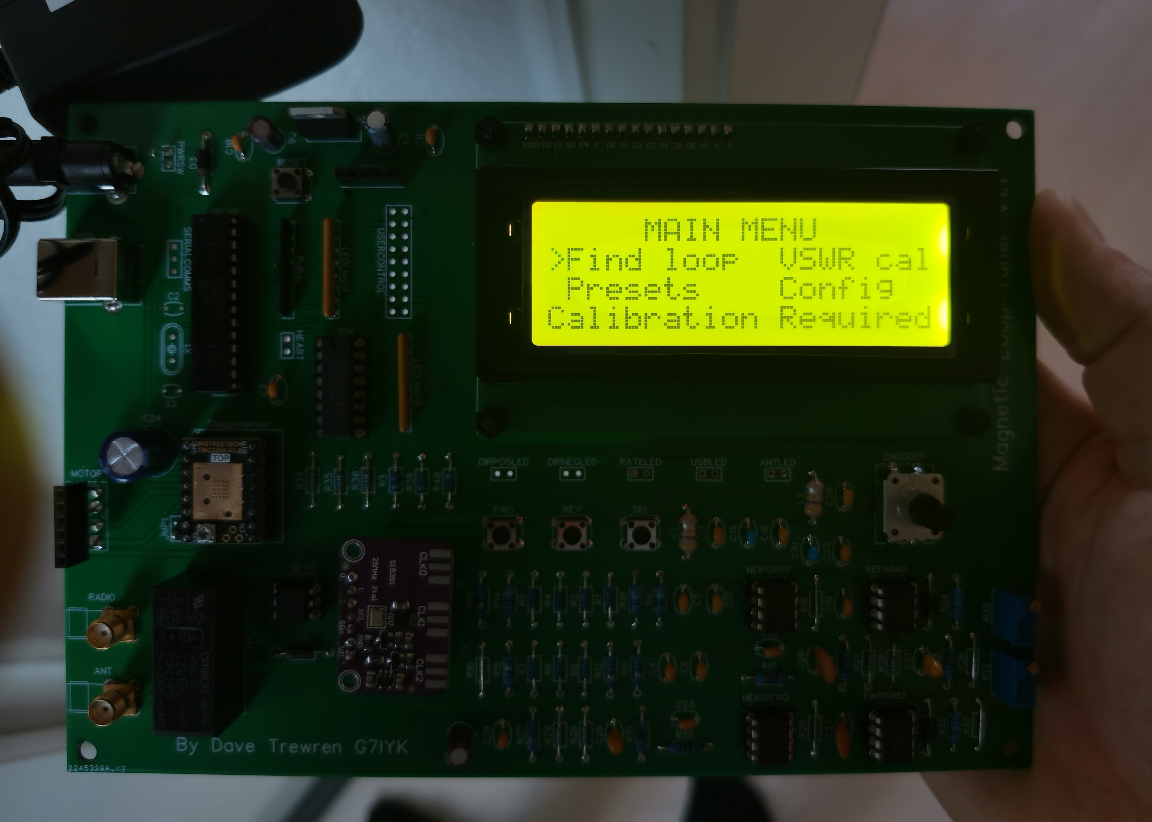 Nachbau von diesem Projekt hier: https://www.instructables.com/Magnetic-Loop-Antenna-Automated-Tuner/ Der Tuner funktioniert erstaunlich gut. Mit einem RigExpert nachgemessen ist die Antenne durch den Tuner wirklich Spot On eingestellt. Im Design von Dave ist ein kleiner Fehler drin: Er benutzt einen Optokoppler (Darlington Typ) um das Relais zu schalten, aber hat den Widerstand für die Diode falsch dimensioniert, sodass ab und zu das Relais nicht schalten wollte. Da es ein Widerstandsarray war, habe ich kurzerhand einfach einen SMD Wiederstand auf die Unterseite der Platine gepackt um den Strom ausreichend zu erhöhen. Damit schaltet das Relais nun auch zuverlässig. Ansonsten ist das 1 zu 1 Daves Aufbau und seine Software. Tuner funktioniert einwandfrei. PCB, PIC und die Mischer habe ich von Dave gekauft, die restlichen Teile von Reichelt und eBay. Waren in Summe 140€ Abzugeben zum Selbstkostenpreis von 140€ plus Porto edit ich sehe gerade ich habe da noch den Silent TMC Stepper Driver vergessen mit in den Preis einzurechnen. Der ist in dem Fall dann geschenkt. Damit läuft ein Schrittmotor leise und ohne quietschen edit2 das Si5351 DDS Modul ist natürlich auch dabei, ist hier auf dem Bild nur nicht gesteckt.