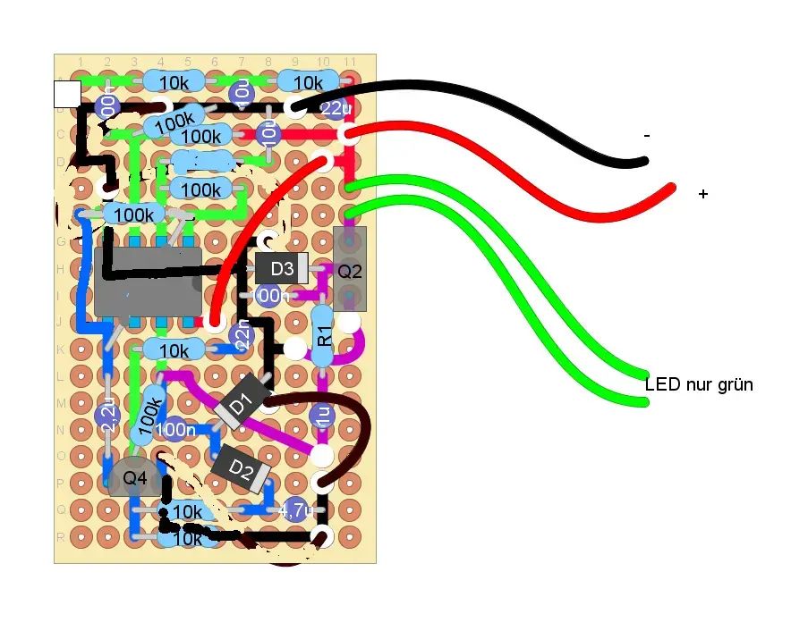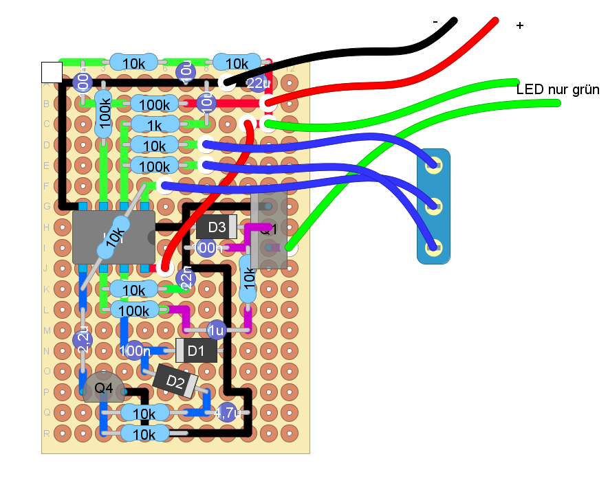 Noch was: Die Beine vom 1µF Elko sind lang genug, dass er selbst die schwarze "Leiterbahn" überspringen kann. Die Rosa Brücke wird dadurch überflüssig. Alternativ kannst du den 1µF Elko mit dem dazu in Reihe geschalteten 10k Widerstandes vertauschen, dann kann der Widerstand die schwarze Leiterbahn überspringen.