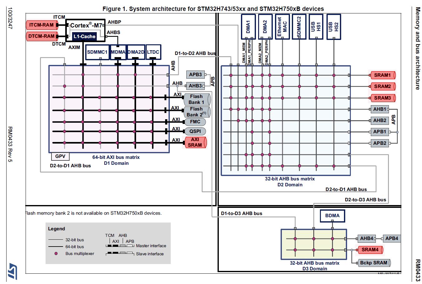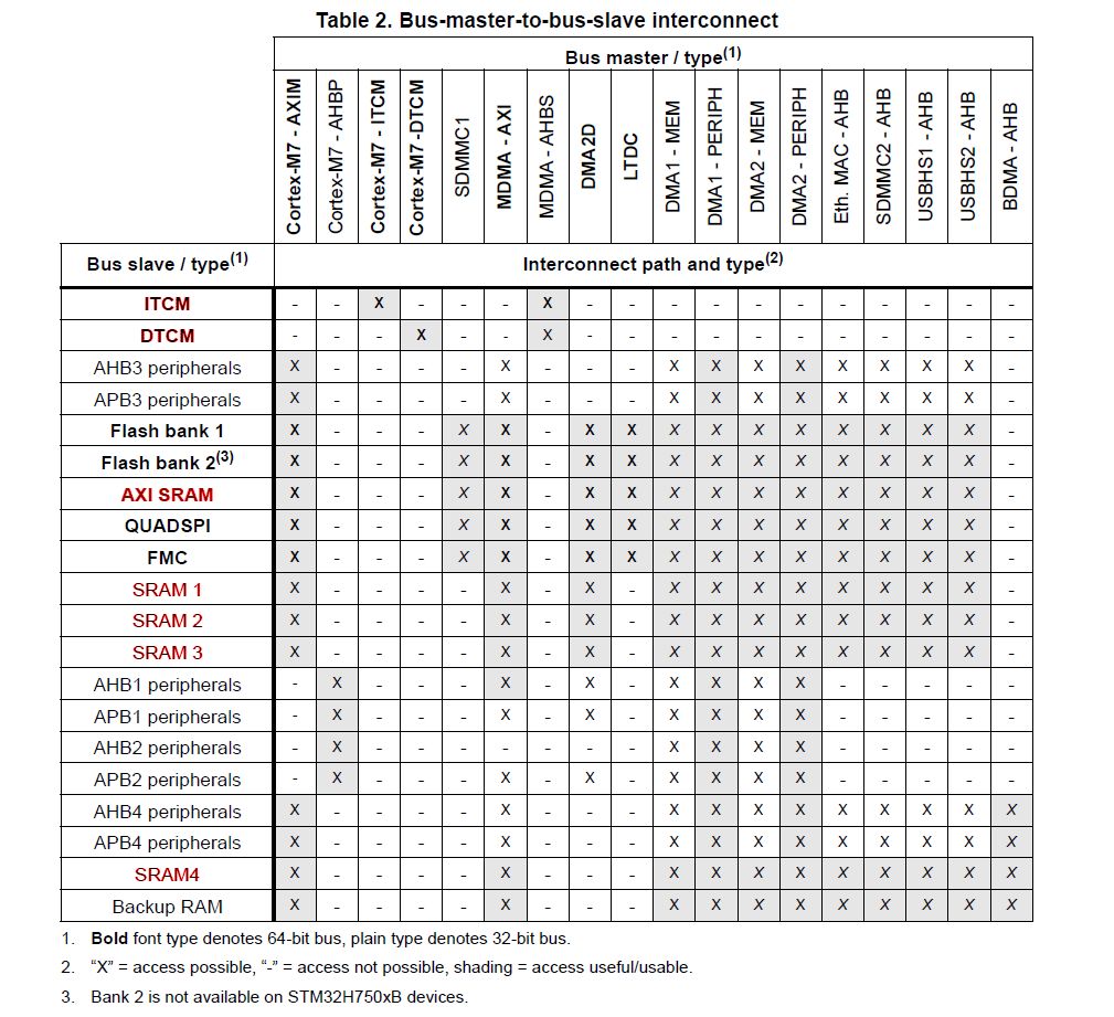 Kevin M. schrieb: > In welchem RAM liegt denn dein Array? Der BDMA kann nur auf den RAM in > D3 zugreifen, wenn ich mich richtig erinnere. Das Array startet bei 0x24000c40 also im 0x24 Bereich welches meines wissens das D1 ist (!). Habe diesen Address Bereich auch in einem DMA tutorial gesehen, und war der default im cube... Muss das morgen mal testen, danke für den Tipp! Bus Matrix 1 und 3 sollten doch zwar paralelle AHB sein welche jedoch an einer AXI Matrix sind. Lese gerade: AXI (Advanced eXtensible Interface) SRAM (D1 domain) is mapped at address 0x2400 0000 and accessible by all system masters except BDMA through D1 domain AXI bus matrix Anscheinend doch nicht?!