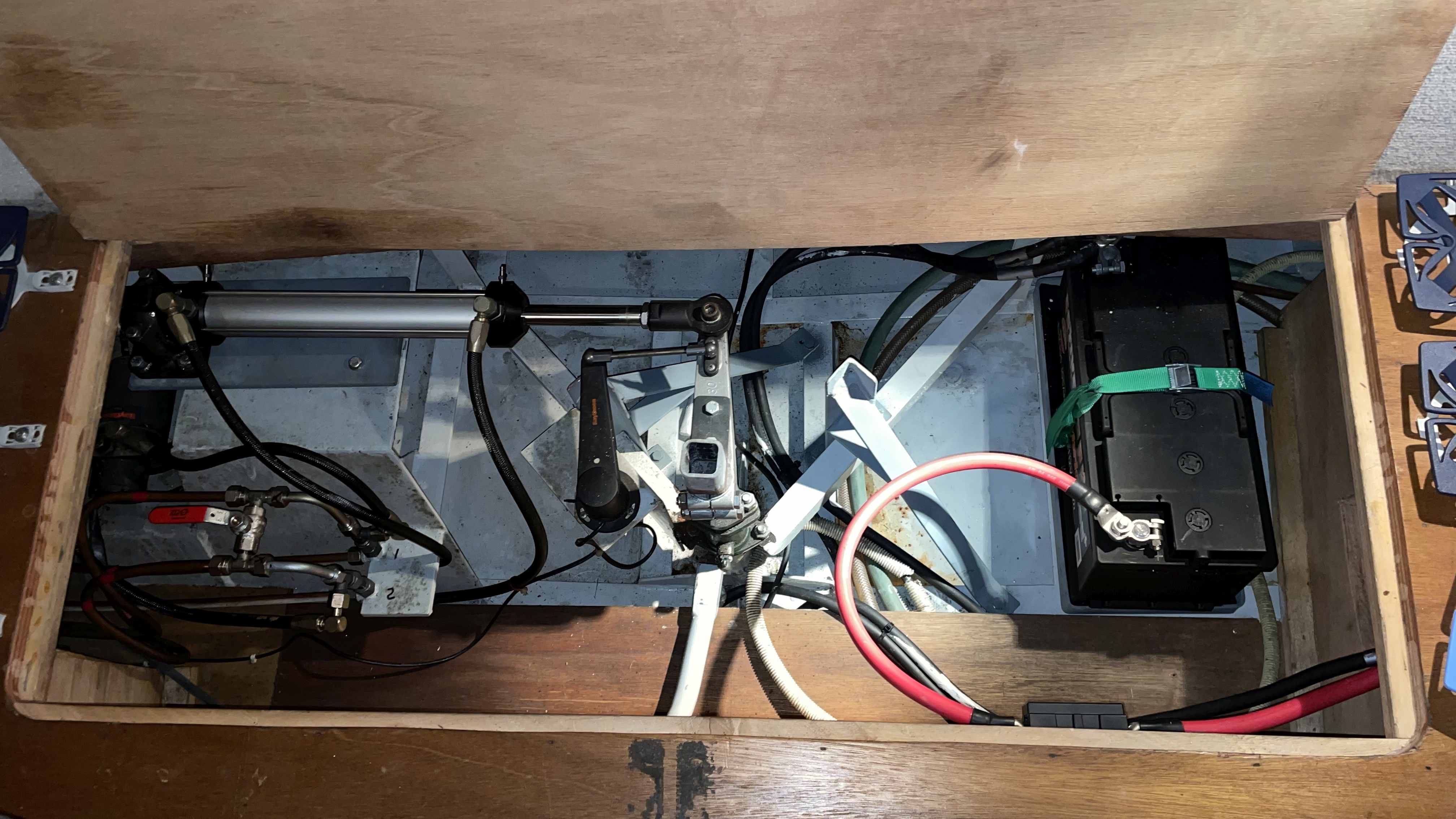 Jedes Strahlruder hat seinen eigenen 105Ah Akku. Der jeweilige Akku steht 30cm vom jeweiligen Strahlrudermotor entfernt und ist mit passenden Leitungen und mit 350A abgesichert angeschlossen. Ursprünglich waren die Strahlruder am Hauptverbraucherakku angeschlossen. Diese Leitungen sind aber viel zu lang und außerdem wurde der Verbraucherakku damit zusätzlich belastet. Diese vormaligen Anschlußleitungen tragen jetzt nur noch die Ladeströme vom Motorraum ins Heck bzw. Bug. Anbei Bilder vom hinteren Strahlruder (nur am Bildrand sichtbar) bzw. der Akkuposition. Geladen werden die Strahlruderakkus nur vom Generator und/oder mit Landstrom. Allerdings wird bei normaler Schiffsnutzung nach maximal 2-3 Tagen entweder durch Motorlauf oder Landstrom vollgeladen.