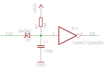 Olaf schrieb: >> Man kann das Problem mit externer Hardware lösen, mittels >> flankengetriggertem Monoflop. > > Ach komm, das ist doch eine Loesung der mangelt es etwas an Eleganz. :) Es reicht auch ein Spar-Monoflop, siehe Anhang. Einen "riesigen" IC ala 73HC123 braucht es nicht. Mittels R1 wird die Zeitkonstante eingestellt, sie sollte bei ca. 15-20 Bitzeiten liegen. C1 sollte man nicht allzu groß machen, denn der belastet das TXD Signal. Klar ist eine Softwarelösung eleganter, aber manchmal artet die in einen Krampf aus, wie hier.
