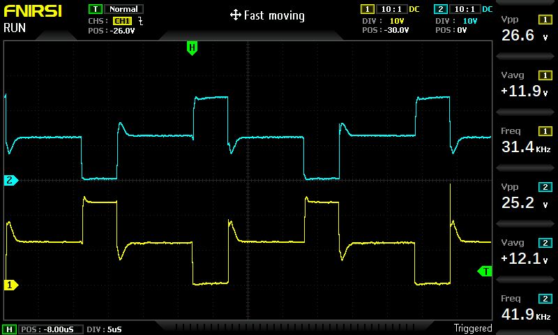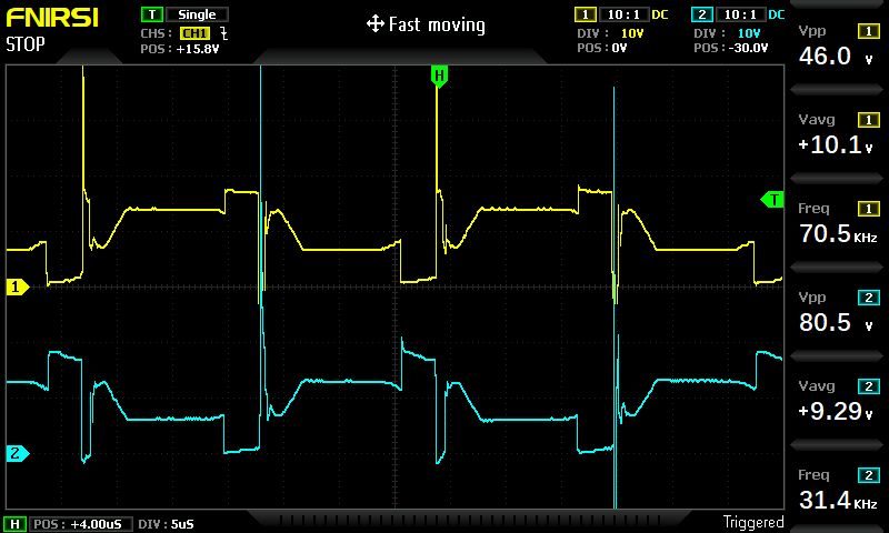 Käferlein schrieb: > Heute habe ich die Einspeiseschaltung aufgebaut und getestet. Geil. Der baut das einfach nach und das funktioniert. Würde ich nie hinbringen. Ich hab gesehen bei meinem $2 inverter modul kostet das porto inzwischen $5. Früher war porto $1.20. Ausserdem komme ich mit dem nicht über 50 watt, danach werden die induktiven spikes beim ausschalten eines FET > 50V und killen den fet. KA was da los ist. Bild ist drain der beiden FET. Das ist ohne den SG3525, die FET hängen direkt am arduino. Das SG3525 IC eliminiert, und das timing scheint zu funktioniern. Nur wie man die spikes eliminiert ... da fehlt mir die erfahrung. Die pwm frequenz von 32 khz könnte man mit einem clone prozessor, dem LGT8F328P auf 64khz erhöhen. Die sind sogar billiger als die at328p.