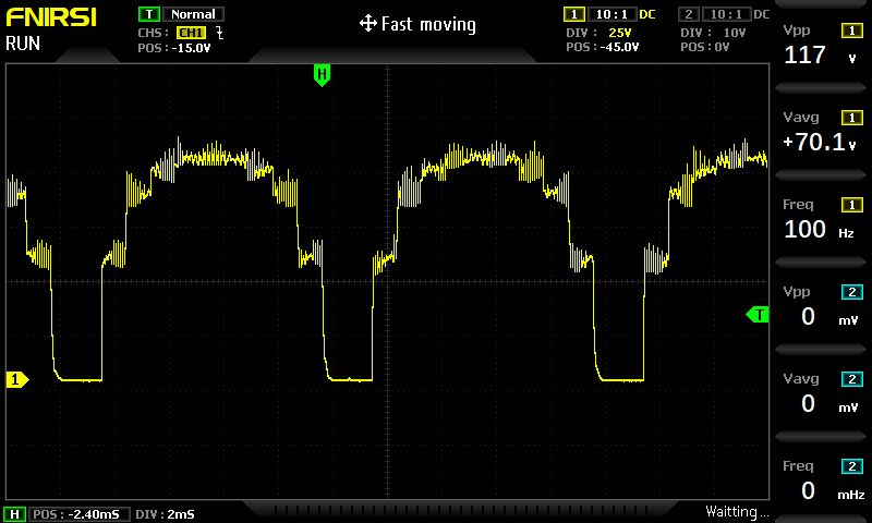 Hab mal ausgang mit L=unbekannt und C=0.3 uF gemessen. R=110 ohm. Die null-gaps und die sintab sprünge sind eindeutig zu sehen. Die sintab sollte drei mal so gross sein. Die spikes kann ich mir nicht erklären. Da schwingt etwas. Das sind 98V am trafo 110V anschluss bei Vin 12.5V. Die PWM ist nur zur hälfte angesteuert, also max 60, möglich wäre 120. Die ausgangsspannung ist proportional zu Vin. Abdul K. schrieb: >> Die machen die Polungsbrücke am Netz mit Thyristoren. Hochinteressant! TY Edit: 117V mit pwm = 87%, an 110 ohm. Das sind 100W+ peak. Aktueller code ist angehängt.