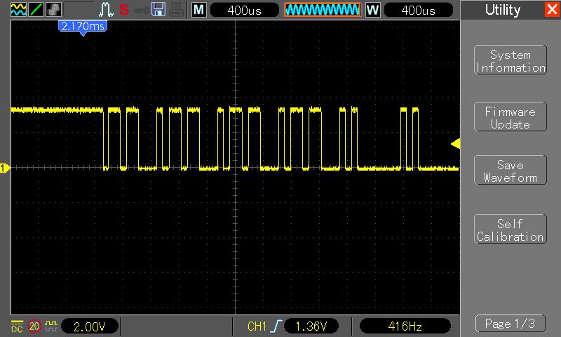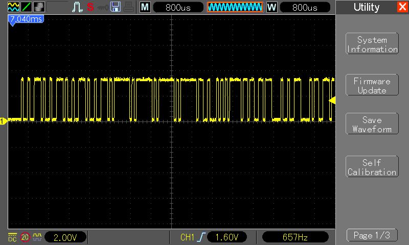 Achim S. schrieb:> Wolfgang schrieb:>> Auf dem Oszi ist vorne L-Pegel zu sehen. Stellt sich die Frage, ob das>> Oszi richtig getriggert wurde.>> Da hast du natürlich auch recht: wenn das nicht der Start der Sequenz> sein sollte, ist die Aussagekraft der Messung gering. Aber immerhin> zeigt die gemessene Sequenz zwei mal hintereinander vier identische> Bytes - ist also nicht ganz unwahrscheinlich, dass es sich doch um den> Beginn der Übertragung handelt.