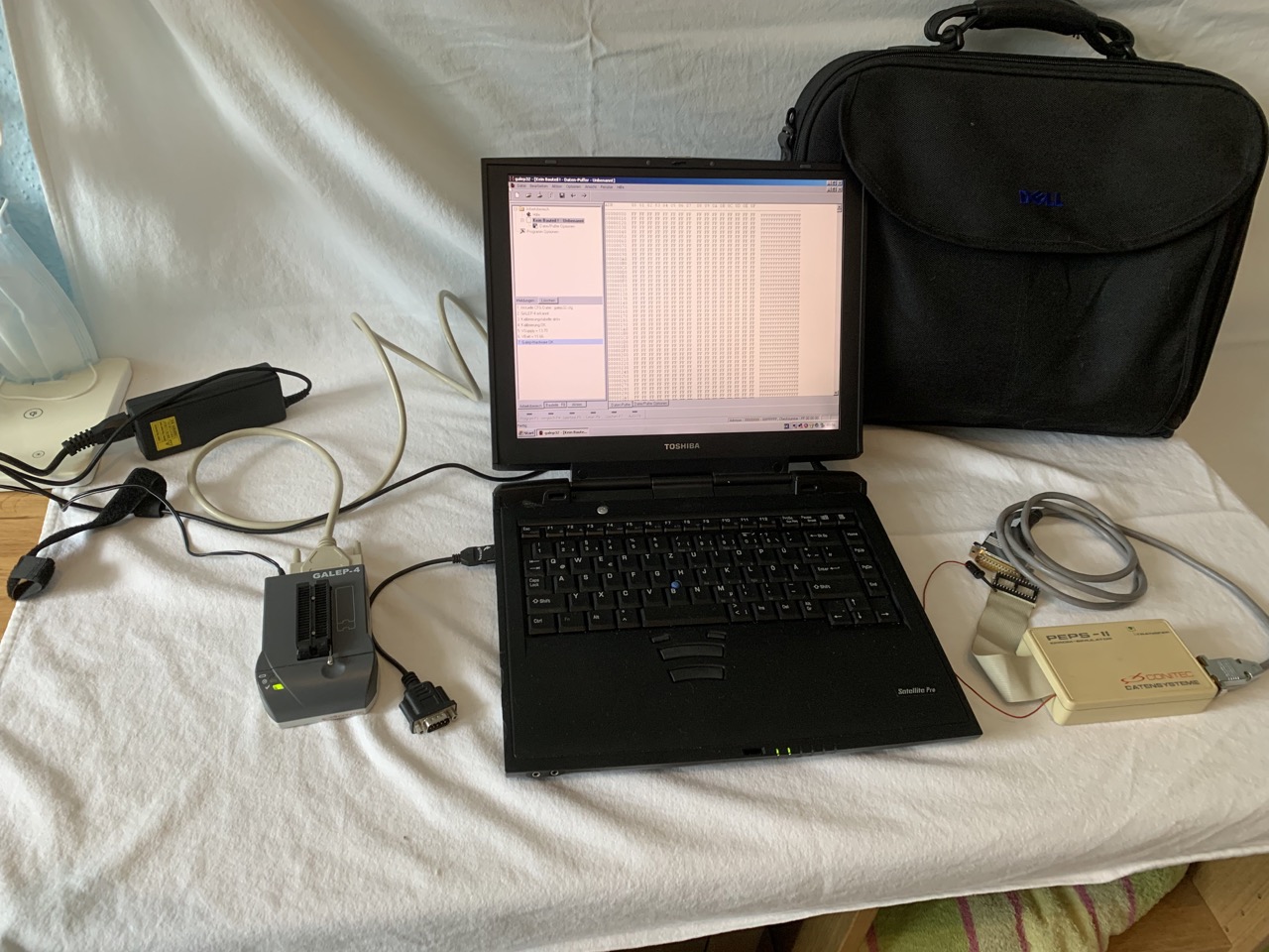 Hallo, ich lese schon einige Jahre hier im Mikrocontroller-Forum mit aber habe bisher versäumt mir einen Account zu erstellen. Da ich schon lange keine EPROMS, GALS usw. mehr für µC programmieren muss und mich nur noch mit AVR's beschäftige möchte ich mich von meinem Equipment trennen und biete hier meine Programmierstation zum Verkauf an. Das Angebot besteht aus: ------------------------ 1 x Toshiba Laptop PSE600E-01P1E-GR mit Win XP HD 6,4GB/384 MB Ram/WLAN (Treiber für den PC und Software für GALEP IV/PEPSII befinden sich auf der Festplatte) 1 x Laptop-Tasche 1 x GALEP IV mit LPT-Kabel, Netzteil und CD (aktuelle Software für den GALEP von conitec ist installiert) 1 x PCMCIA Seriell-Karte mit Kabel 1 x EPROM-Simulator PEPS II mit Anschlusskabel Leider ist der Akku vom Laptop schon lange verstorben. Ich habe die Zellen aus dem AKKU-Gehäuse entfernt. Dadurch vergisst der Rechner leider seine Systemzeit und die BIOS-Einstellungen. Man muss also einmal ins BIOS-Menü und das wieder verlassen damit der Rechner die Festplatte erkennt und bootet. Ist also keine große Tat. Der GALEP IV funktioniert einwandfrei. Habe erst die Tage damit einen verfus(e)ten ATMEGA328 im HVPP Modus reaktiviert. Den PEPS II hatte ich zuletzt vor 5 Jahren für ein Projekt benutzt. Ich gehe davon aus dass er immer noch ok ist. Unter XP habe ich ihn für den Test heute nicht zum laufen gebracht. Laut Vermerk auf der Downloadseite von conitec soll das Programm "DirectIO" für die PEPS.EXE genutzt werden. Die Konfiguration habe ich wohl nicht korrekt durchgeführt. (Der PEPS ist also eher als ein Goodie zu sehen) Als Kaufpreis stelle ich mir 150,-€ vor. Gerne kann das Ganze vor Ort (Bochum,NRW) begutachtet werden oder ich versende den Kram gegen Vorlasse+Versandkosten. Ich habe noch ein paar Fotos angefügt damit ein besserer Überblick entsteht. Alles andere kann man ja noch besprechen. Gruß Jörg