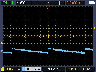 Ich habe jetzt nochmals das Oszi angehängt. Mein Board verhält sich wie ich oben schonmal gepostet hatte. Also anders wie zu Stefans Boards. Bei mir steigt die Stromaufnahme mit steigender Eingangsspannung ? 10V => 12mA 15V => 21mA 18V => 26mA 19V => 0,24mA* *Das Board schaltet ca. bei 18.5V ab. D.h. keine Ausgangspannung mehr und an Pin3 ist auch kein Signal mehr messbar.
