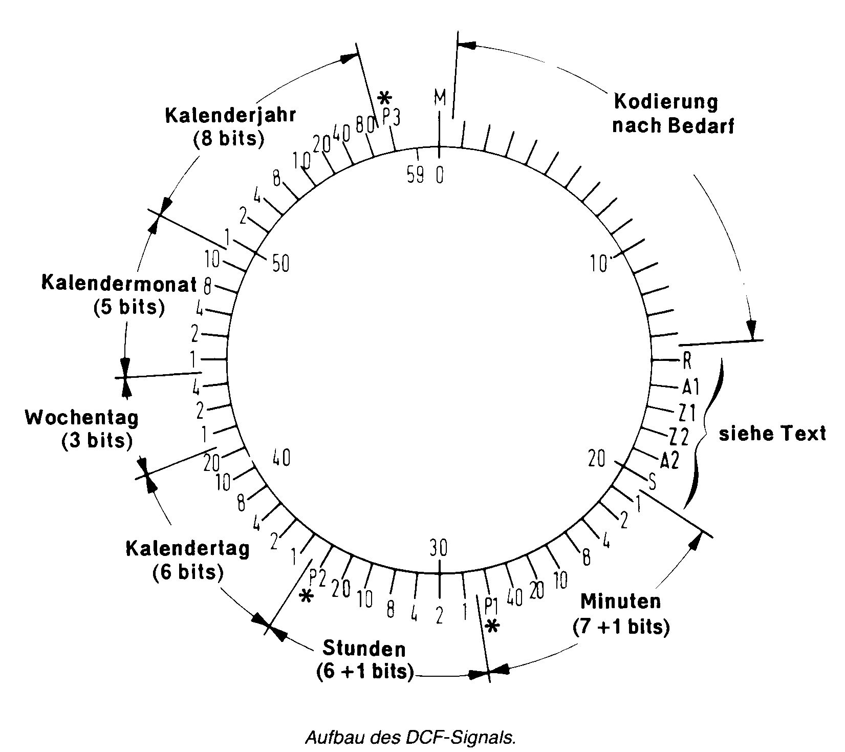 Ich hab' dir doch oben den Aufbau der Zeitinformation gepostet, das ein Quasi-BCD-Code mit Paritäts-Prüfbits dazwischen. Aus der Grafik kannste fast alles 'rauslesen!