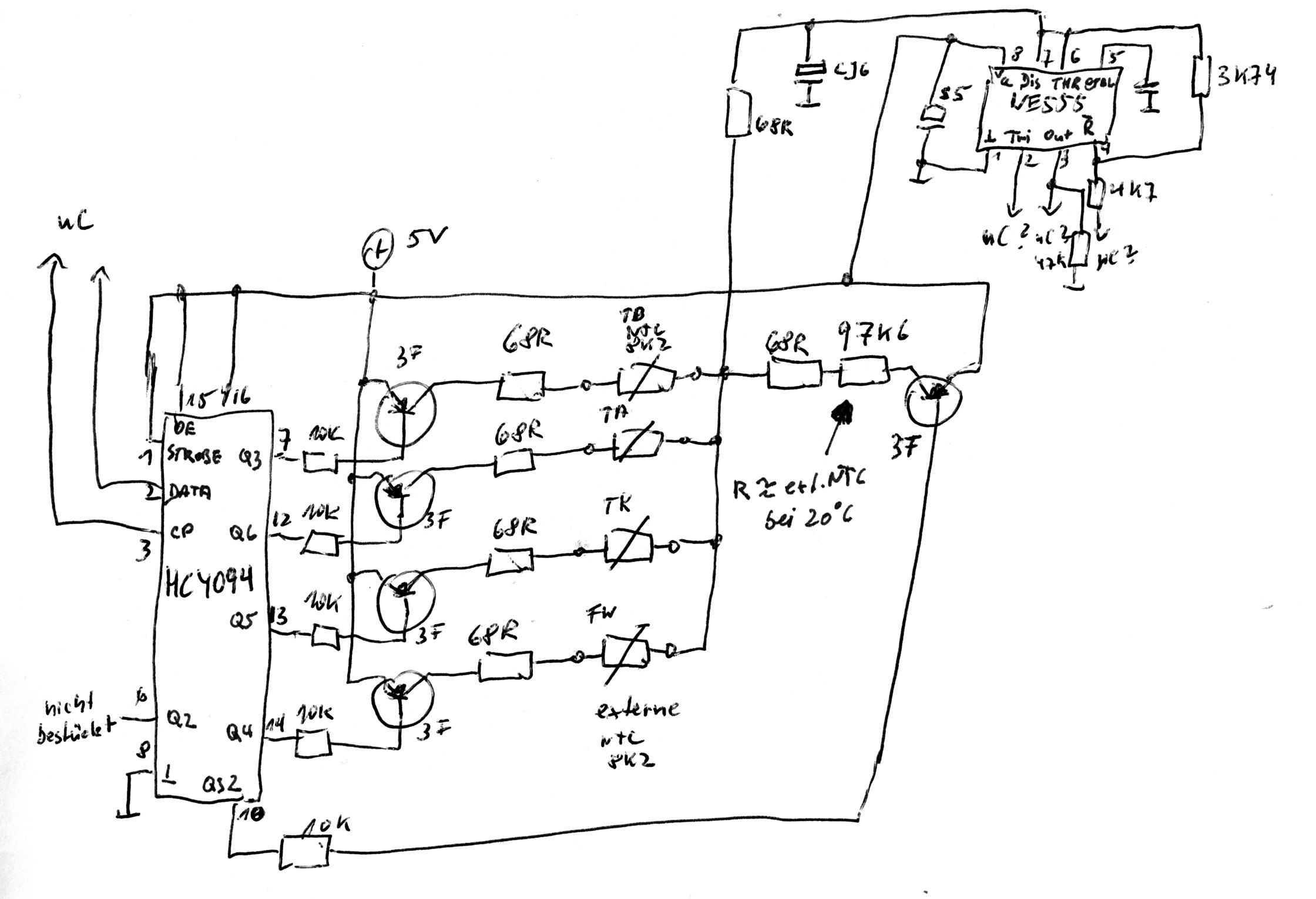 Hallole, ich habe hier eine ältere, uC-gesteuerte Heizungs- und Warmwassersteuerung. Dieser wertet aktuell drei Temperatursensoren (NTC mit 8k2 Nennwert) aus - Außentemperatur (TA), Warmwassertemperatur (TB) und Kesseltemperatur (TK). Außerdem läßt sich über einen sog. Fernwähler (nicht angeschlossen) das Temperatur verändern. Ich würde gerne, wenn irgend möglich, diese Temperaturwerte mit einer eigenen Elektronik (das Ersetzen der alten Steuerung durch etwas eigenes kommt nicht in Betracht, da viel zu aufwändig) auswerten und habe daher die Schaltung anhand der Platine aufgenommen, soweit möglich (der Prozessor ist mit einem verlöteten Blech, vielleicht zur Kühlung oder auch Abschirmung abgedeckt, das ich nicht entfernen wollte). Die Funktion der Schaltung - siehe anliegende Skizze - ist mit insofern leider ziemlich schleierhaft. Klar, das Schieberegister 4094 wird durch den Prozessor angesteuert und dieses beaufschlagt die NTC und/oder den rechten Widerstand 97k6 (ausweislich der der Temperaturtabelle der NTC recht exakt deren Widerstand bei 20° C) - je nachdem, welche PNP angesteuert sind - mit +5V und beeinflußt auf diese Weise irgendwie den NE555. Hat vielleicht einer von euch eine Vermutung, wie damit die Temperaturen ermittelt/festgestellt werden können? Ich hätte erwartet, daß die NTC jeweils Teil eines Spannungsteilers und die Spannungen - ggfs. über einen 4066-Analogschalter (die Schaltung ist aus den 90er Jahren, da gab es vielleicht noch nicht erschwinglich uC mit vielen A/D-Eingängen) - an einen A/D-Eingang geleitet werden ... aber das?