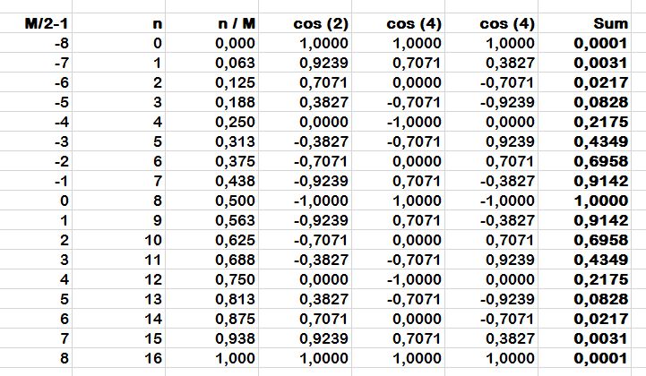 Gerade wird hier diskutiert, wie ein Blackman-Fenster einzusetzen wäre. Beitrag "Re: Ergebnisse einer FFT zusammen fassen" Dazu habe ich eine Frage zur Nummerierung: In der WP wird von der Zahl der digitalen Samples 'M' gesprochen und der Index einmal von 0 ... M-1 und einmal von -M/2 ... M/2 - 1 laufen lassen. https://de.wikipedia.org/wiki/Fensterfunktion In beiden Fällen ergibt sich mit den COS-Funktionen der Fenster z.B. Hamming und Blackman ein gleicher Verlauf. Allerdings sehe ich ein Problem mit den Indizes: Benutze ich das Beispiel aus der WP mit "M = 16" dann ergibt sich die Tabelle, die ich angehängt habe. Ich habe die Formel aus dem Beitrag von oben genommen, sie sind aber mit denen aus der WP gleich. Wie jeder sieht, schließt die Cosinusfunktionen bei 0 und 16 genau auf der Achse ab. Die Vielfachen von 2*PI*n tun das logischweise auch. Das sind aber 17 Werte!!! In der WP wird davon gesprochen, dass bei allen diesen Funktionen der erste Wert n=0 wegzulassen wäre(?), bzw. zu "0" wird und deshalb in den Darstellungen nicht vorhanden sei. Abgesehen davon, dass der Finalwert nicht exakt 0 gibt, sondern 0.001 ergibt sich dann ein Symmetrieproblem, wenn 16 Koeffizientenwerte für 16 samples genutzt werden, weil der letzte denselben Wert wird der 0te hat, aber drin bleibt. Das gleiche hat man, wenn 0 ... M-1 genutzt werden. Wie passt das zusammen? Bei einer großen Zahl von Audiosamples, z.B. 1024 ist es wahrscheinlich egal, wenn es einen shift, gibt, aber ich hätte totale Symmetrie erwartet. Welche Koeffizienten wären bei 16 samples zu benutzen?