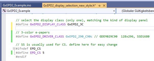 So, es geht auch besser. Die Demo der GxEPD2 Bibliothek mit dem ESP32 funktioniert. Damit kann man schon richtig 'was anfangen. Die richtige Auswahl des Displays im Screenshot oben.