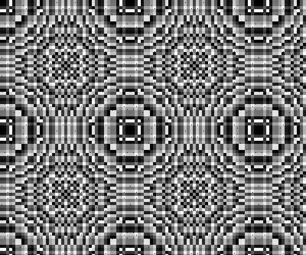 Hier noch zwei Beispiele mit nicht ganzahliger Potenz 1,1 und 1,111 statt x-Quadrad. R = Wurzel (x*x + y*y) Y = (R hoch 1,1111) Modulo M; mit M = 7 und 8 Das zweite fängt weiter in der Mitte des Bildes an, bei etwa x,y=100.