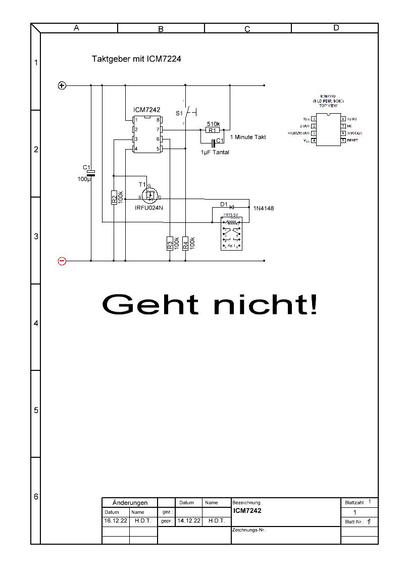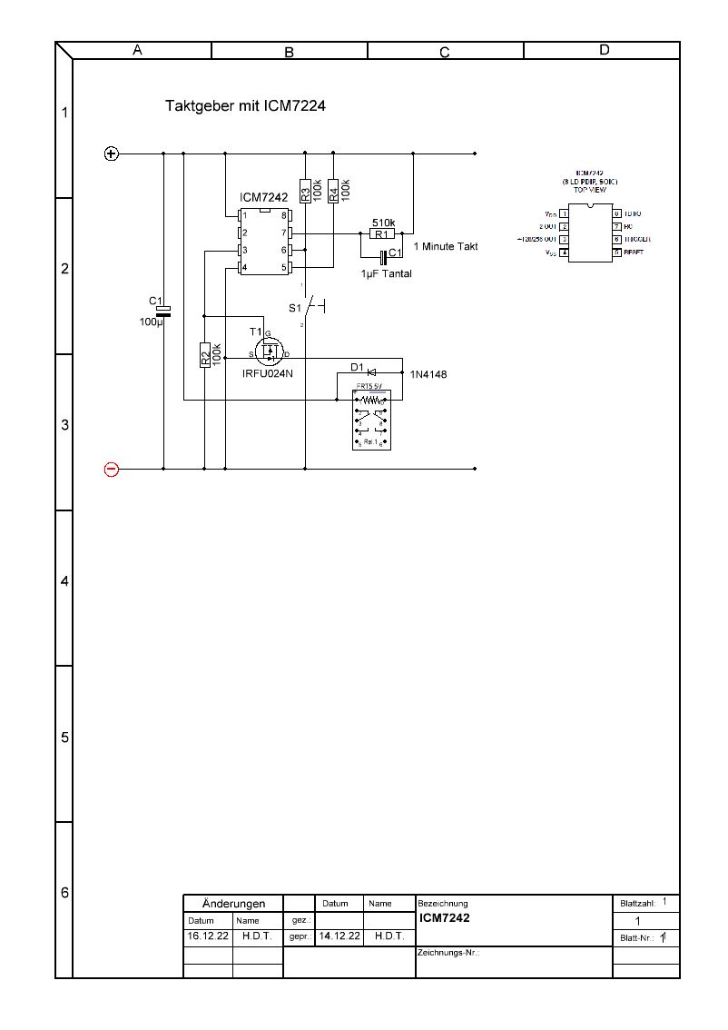Hallo, kann jemand mit einem Schaltplan oder Link helfen? Ich möchte einen Taktgeber mit dem ICM7242 machen und wenn es geht, die Grundschaltung schon mal haben und darauf dann selbst aufbauen. Die Schaltung soll an 15 Volt betrieben eine LED für 1 Minute einschalten und dann 1 Minute AUS. Danach wieder das gleiche von vorn. PS Schaltungen mit dem 555 CMOS-Type sind mir bekannt, ich möchte es aber mit dem ICM7242 machen.