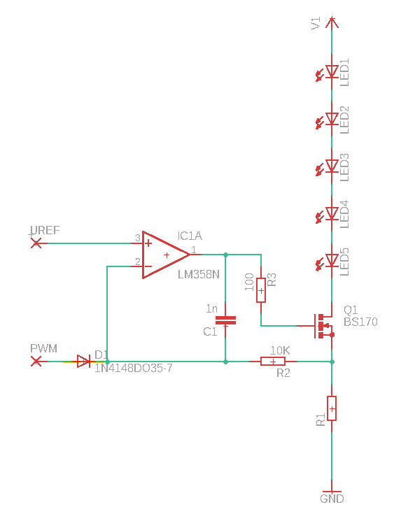 Noch zwei Schaltungen zur Inspiration: https://europe1.discourse-cdn.com/arduino/original/4X/5/a/c/5ac34afe85c40505c11256a8d7d317aeca5935af.jpeg Das wäre jetzt mit einem konstanten Strom, den der Mikrocontroller an/aus schalten kann. oder diese: https://www.mikrocontroller.net/attachment/381706/Schaltung_KSQ.png Hier wird PWM in einen steuerbaren Konstantstrom umgewandelt.