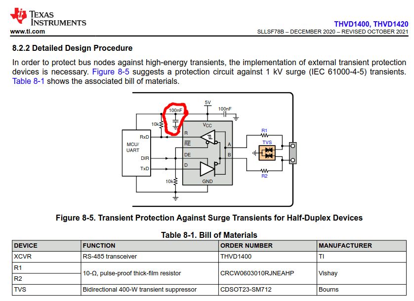 Servus! Welchem Zweck dient der rot markierte Kondensator? Ist damit ein Abblock-C für die MCU gemeint? DB, Seite 19: https://www.ti.com/lit/ds/symlink/thvd1400.pdf Danke & Grüsse Paul