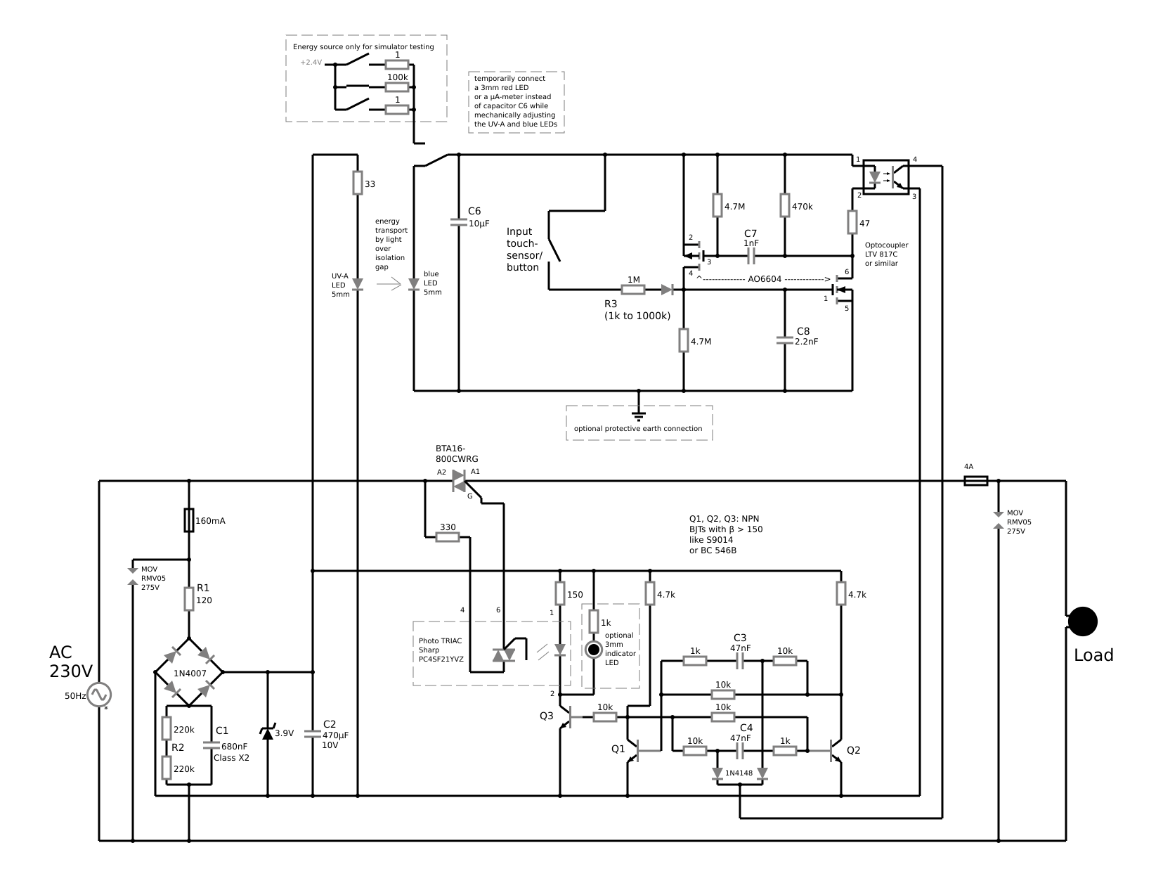 ArnoR schrieb: > wieviel Energie der transportiert und welche Spannungen/Ströme man > bekommt. Auf der "sendenden" Seite fließen ca. 18mA durch die UV-A LED, an der dabei eine Vorwärtsspannung von ca. 3,3V abfällt. Auf der "empfangenden" Seite fließen ca. 20µA durch die blaue LED, wenn an dieser nur eine Ohm'sche Last von 1kOhm angeschlossen ist. Genauer wollte ich das nicht messen. Es ging mir bei der Schaltung auch nie um eine besonders gute Effizienz bei der Energieübertragung von primär nach sekundär - selbst bei < 0,1% Effizienz werden auf der primären Seite, inklusiv LED-Vorwiderstand, nur ca. 70mW für die "Beleuchtung" aufgewendet, also deutlich weniger, als z.B. allein R1 verbrät, der nur Stromspitzen beim Einschalten vermeiden muss. Die Schaltung insgesamt verbraucht (ohne Last, bei angeschaltetem TRIAC) ca. 750mW.