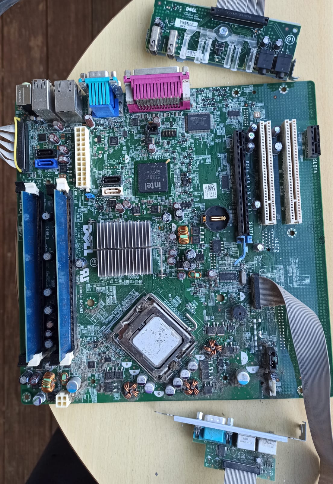 Hier ein älteres Dell -Board mit Ram und Prozessor. Dazu die passende Grafikkarte. Verhandlungsbasis ist 16 Euro. Bis vor 8Wochen lief das Teil noch. Anfragen nur per PN mit Mailadresse damit ich Veränderungen angeben kann.