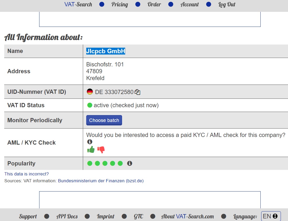 Das Impressum von JLCPCB GmbH in Krefeld verlinkt beim Impressum auf der JLCPCB Hong Kong Webseite, mit Chinesische Daten. Also, ein Katze und Maus Spiel läuft auch beim Impressum ab. Das könnte man abmahnen lassen, aber was nützt es mir. Google hat mir dann die Deutsche Tel Nr. von JLCPCB im Krefeld verraten, 021514169886. Da geht eine sehr hilfsbereite Dame ans Telefon, der das Problem bekannt ist. Sie hat kurz mit einem Kollegen Rücksprache auf Chinesisch gehalten, und konnte an Hand einer Bestellnummer alle alte Rechnungen auch einsehen. Sie sagte, Krefeld ist aber nur zuständig für Europaket. NACH der Verzollung, soll die MwSt. ausgewiesen werden. Die Verzollung läuft gerade noch. Also einfach nachher die Rechnung abfragen, dann steht auf einmal die MwSt Nummer drauf. Bei mir ist aber der Verkäufer: JLCPCB in Hongkong. Da kann man dann aber nicht einfach so eine MwSt Nummer einer Deutschen GmbH drauf schreiben. Aber das warte ich erst mal ab dann. Noch ein Tip für die Bezahlung: Da wird dann über Paypal immer ein Paar Prozent mehr abgerechnet als auf der Rechnung steht. Wenn ich dann eine JLCPCB (HongKong) Rechnung von 100 Euro bezahlen will, bezahle ich am Ende auf 104 Euro. Einfach die Papyal Kreditkarte verwenden. Wenn ich damit 100 Euro bezahle, werden auch 100 Euro abgerechnet. Gerhard, die MwSt Nummer 333072580 welche bei dir darauf steht, gehört der GmbH in Krefeld. (Siehe Abfrage) Dann müssten die auch mit dem Namen auf der Rechnung stehen dann. Bei mir steht JLCPCB Hongkong darauf.