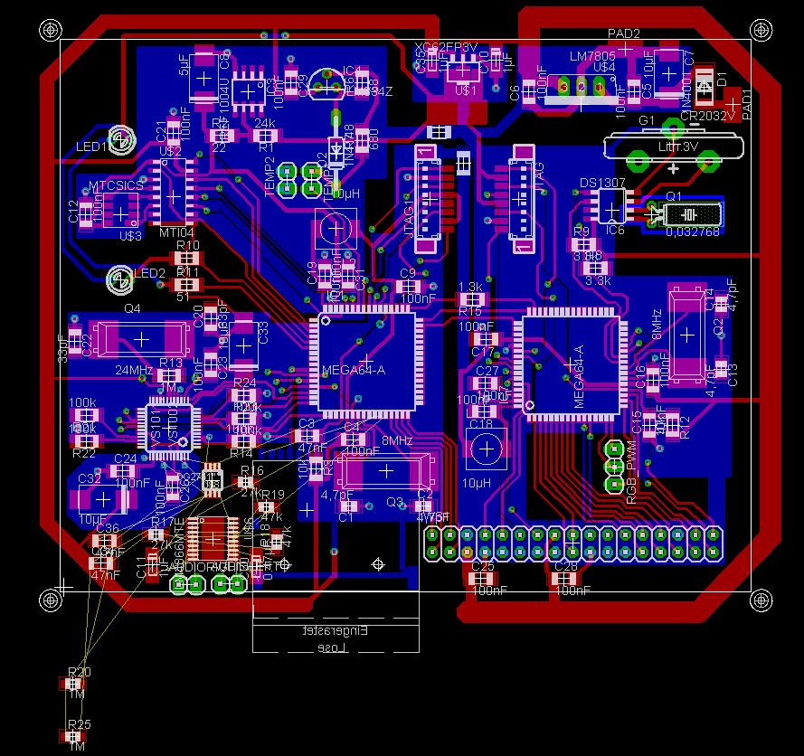 ich bin eigentlich schon von der elektronik her fertig (siehe anhang - eine von insgesamt 3 platinen). hab wie gesagt 2 atmega64 genommen, weil ich auf der sicheren seite sein wollte. dass die das packen bin ich mir sicher. hatte mal n projekt mit 3 anderen zusammen: mp3-player mit gps. da hat ein atmega64 das alles geschafft: - mp3 decoder mit daten füttern - gps-daten empfangen - gps daten auswerten (berechnungen wie geschwindigkeit etc) - sd-karte lesen (mp3 dateien) - sd-karte schreiben (gps koordinaten) - auswerten von 5 tastern mit tasterkombinationen - ansteuern von nem grafikdisplay - batteriemanagement von nem lipoly-akku und das alles zeitgleich. hat zwar noch kleinere bugs, aber im wesentlichen funktioniert alles miteinander. (der atmega läuft mit 8mhz) da war ich schon erstaunt, was n atmega alles kann ^^ süßes kleines ding! aber es hätte genausogut nicht funktionieren können. wir hatten eben glück dass er alles geschafft hat auch wenn er jetzt ganz schön ausgelastet ist. mich interessiert es, wie man im vorfeld schon abschätzen kann, wie groß die software wird und welcher controller dafür verwendet werden muss? beispielsweise wenn man mehrere 32-bit berechnungen macht, ists ja egal wieviel i/o pins der controller hat. da will ich wissen: schafft der controller es die software vollständig und fehlerlos zu bearbeiten? grüße fred0815