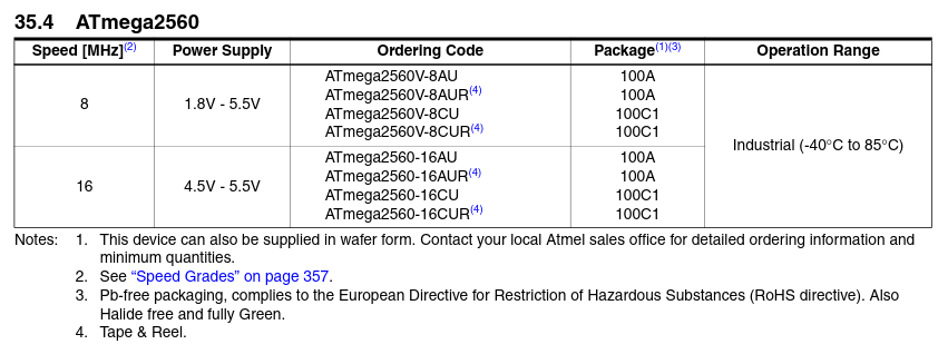 wobei das DB Schrott ist: "2560/V-2561/V 8-bit Atmel Microcontroller with 16/32/64KB In-System Programmable Flash" Der 2560/1 hat eben 256KB In-System Programmable Flash und nicht 64KB und alle laufen ab 1,8V mit folgenen Takten Speed Grade: – ATmega640V/ATmega1280V/ATmega1281V: • 0 - 4MHz @ 1.8V - 5.5V, 0 - 8MHz @ 2.7V - 5.5V – ATmega2560V/ATmega2561V: • 0 - 2MHz @ 1.8V - 5.5V, 0 - 8MHz @ 2.7V - 5.5V – ATmega640/ATmega1280/ATmega1281: • 0 - 8MHz @ 2.7V - 5.5V, 0 - 16MHz @ 4.5V - 5.5V – ATmega2560/ATmega2561: • 0 - 16MHz @ 4.5V - 5.5V