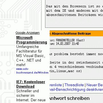 Bei einigen Beiträgen habe ich das Problem, das die letzte Zeile im Beitrag abgeschnitten ist. Entweder sind nur wenige Pixel zu erkennen, oder die letzten unteren Pixel fehlen. Ich verwende den IE6.0 Im "alten" Forum gab es das Problem nicht. Liegt das am Forum oder am IE?