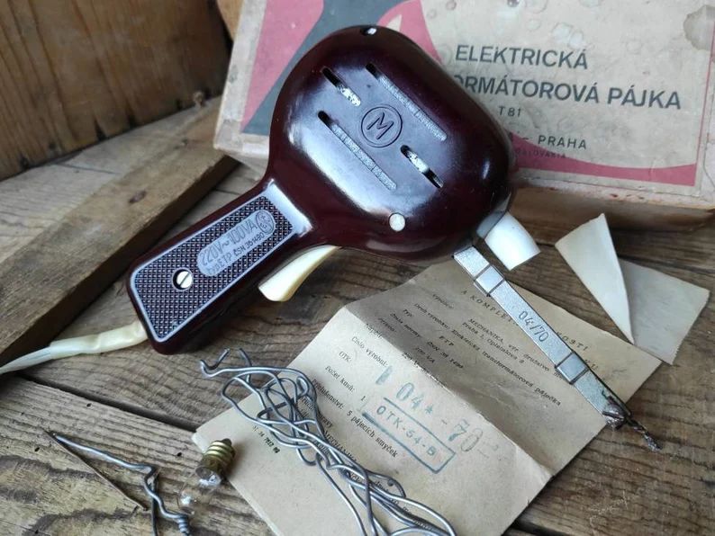 Das DDR-Teil könnte von der Anmutung her auch problemlos ein (Gesamt-D)-Produkt der 1920er Jahre sein. Vielleicht ist es sogar eine Kopie davon, aber angeblich wurde die erste Lötpistole der Welt erst in den 40ern von einem gewissen Herrn Weller patentiert. Warum die Mühe mit dem Aufdruck "Nur für Gleichstrom?" Bei dem was es in der DDR alles nicht gab, war es doch wohl sehr unwahrscheinlich, irgendwo ausgerechnet Gleichstrom zu bekommen. Womit wir wieder bei den 20er Jahren sind, da war das noch üblich, je nach Haushalt die eine, die andere oder beide Sorten zu haben. Die Steigerung von altertümlich gab's dann in der Tschechei mit dem Löteisen T81 (nicht zu verwechseln mit dem gleichschweren Kampfpanzer T74): https://www.etsy.com/de/listing/1218657764/vintage-elektrisches-transformator