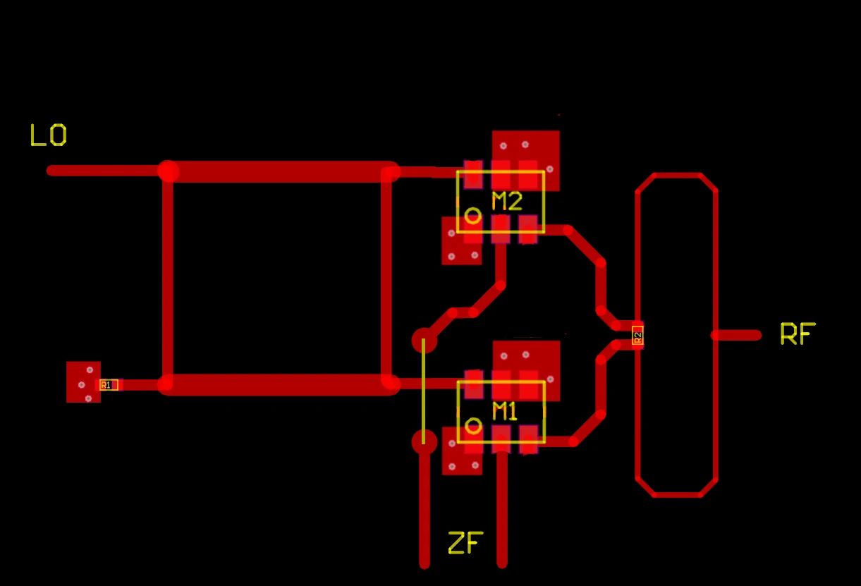 Marcel B. schrieb: > Muss es die Lösung > mit 2 Mischern werden oder ist auch eine andere Alternative denkbar? ja, ich würde es gerne ausprobieren, wie gut es funktioniert. Genau deshalb möchte ich gern einen PCB machen davon. Ich habe noch kein richtiges Layout, aber ich habe im Anhang mal skizziert, wie ich es meine. M1 und M2 sind die beiden Mischer, R1 ist der Abschluss für den Hybrid und R2 ist der Isolationswiderstand vom Wilkinson-Splitter. Ich denke, dass hier die Isolation nötig ist, denn die Mischer haben am RF Port nur ca. 10 dB Anpassung, d.h. es wird einiges reflektiert, und ich könnte mir vorstellen, dass man nicht möchte, dass die Reflexionen vom einen Mischer in den anderen Mischer gelangen können. Deshalb schadet es sicher nicht, dem Wilkinson den Isolations-R zu spendieren. Ich denke auch, dass ich bei der LO-Seite der beiden Mischer noch ein paar dB Dämpfungsglieder rein baue, um die Anpassung dort noch zu verbessern. Auf der ZF Seite soll es dann zu einem Red Pitaya gehen. Wenn es der Platz zulässt, werde ich dort noch einen Diplexer spendieren, sodass die Mischer einen guten ZF Abschluss haben.3 Ich frage mich, ob es OK ist, die eine ZF Leitung unter den Mischern durch zu führen, oder ob das Probleme geben kann. Die Alternative wäre halt, mit einem Via auf die andere Seite zu gehen, und dann dort die Signale irgendwie weg zu führen, aber dann wird halt die Massefläche verletzt, was auch nicht so toll ist. (Die ganze Rückseite des PCBs soll Masse sein.)