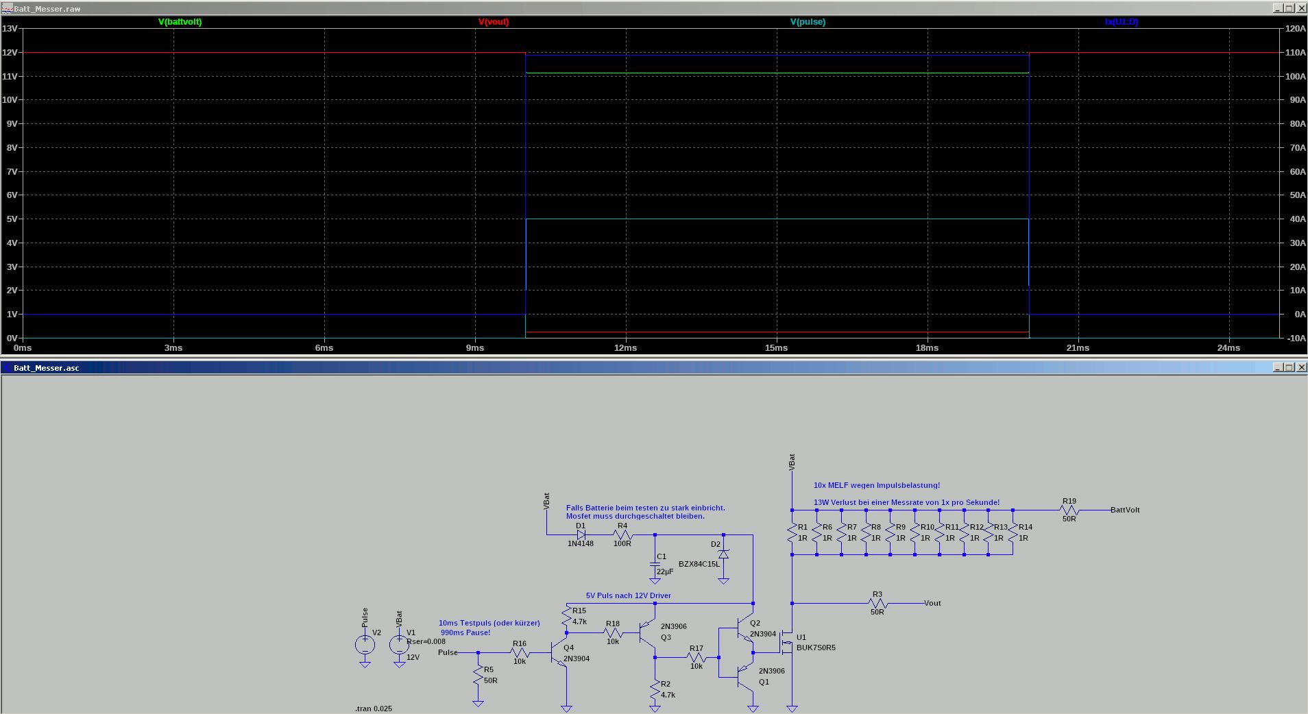 Mein Leute, Ich brauche eine kleine Testschaltung um den Innenwiderstand meiner Motorradbatterie zu messen/testen. Ich dachte ich stelle das mal zu Diskussion. Transistor hier: https://www.nexperia.com/products/mosfets/automotive-mosfets/BUK7S0R5-40H.html Irgendwas zu meckern? Ist halt bloed wenn man bei solchen Schaltungen was uebersieht. .-) Vanye