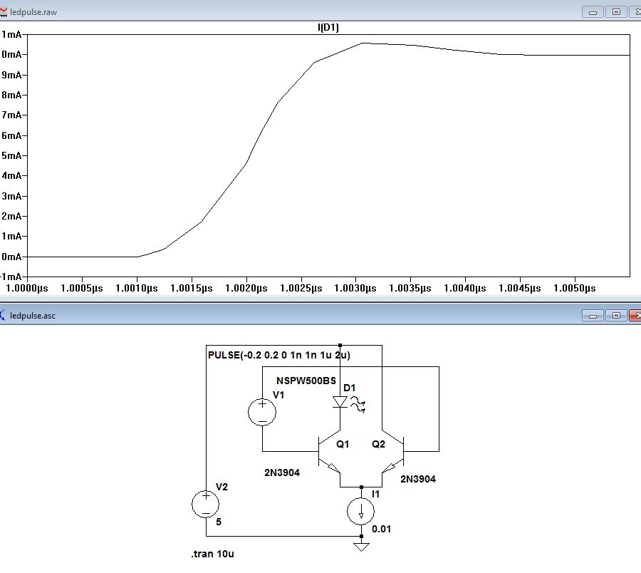 Das deine Simulation mit 50ns breiten Pulsen nicht klar kommt, sollte doch nicht wirklich verwundern. Trag da die realen 10us ein, und schon sieht die Welt in Ordnung aus. Im Anhang mit einem schnarchlahmen AD823 und einem MOSFET als Steller - den würde ich dir bei den Präzisionsanforderungen übrigens auch empfehlen, bei einem NPN fließt der Basisstrom zwar unten durch den Widerstand, aber nicht durch die LED. Bei schnelleren OPVs ist die Zuleitungslänge absolut kritisch. Mit einem AD8066 auf maximale Flankenteilheit getrimmt (10-90% in 75ns) schwingt es in der Simulation bei 30nH in Serie zur LED - experimentelle Evaluierung steht noch aus :)