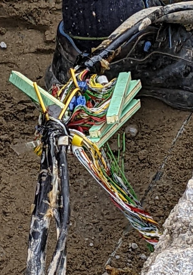 Ich bin gestern natürlich noch einmal zu dem neuen Verteiler gegangen, er steht ja nur wenige Hauser weiter. Die Kabel außerhalb des Verteilers liegen noch frei, sonst dürfte alles fertig sein. So wie es aussieht musste wirklich jedes einzelne Kabel verlängert werden, das war sicherlich deutlich mehr Arbeit als bei einem einfachen Unfallschaden. Für den nächsten Brand/Unfall/Umbau an dieser Stelle sind jetzt die Reserven da. Wegen der doch eher lockeren Bebauung mit überwiegend freistehenden Ein-und Zweifamilienhäusern auf zumeist großen Grundstücken waren es glücklicherweise nicht viele Anschlüsse. Um diesen Thread (für mich) abzuschließen hänge ich noch drei Fotos an, so oft sieht man ja nicht die Kabel an so einem Verteiler und so viele Muffen.