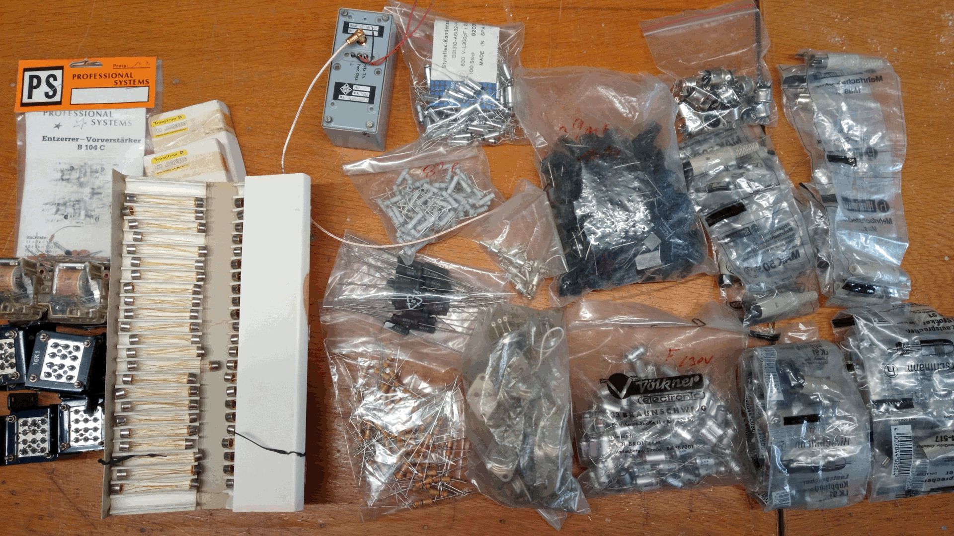 Hallo - ein Nachtrag zu Liste VI Platz 14. Ich hab beim "kruschteln" noch ein paar Teile für die Kiste gefunden: Bauteile: div. AD133, 2N3997, Power MosFET N u P gepaart für HiFi-Endstufen je J48 2E1 und K133 2E1 mit Glimmersch u Nippel, Relay 28V 4x Wechsler 10A, Stromstoßrelay Spule !8VAC! 1x Schließer, EDV: div. alte ZIP-Disk 100MB + 250MB, REV-Cassetten 120GB, 4mm DataTape DDS3 125m, DDS Cleanicg Tape, div. Floppy-Laufwerke 1,2 MB 5,25" und 3,5" div. CD u DVD Brenner, Travan T1000 400MB, div. EDV-Kabel u Adapter IDE, SCSI, SATTA, Stromversorgung, PS2 Kabel u Adapter Audio: DCC 60 Cassette, MD MiniDisc 74,