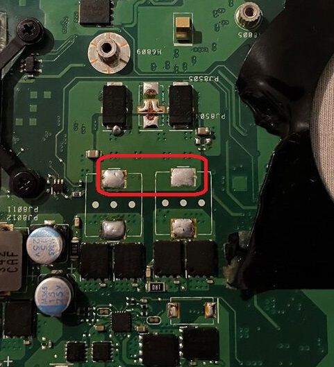 Ich habe einmal das Bild des Mainboards angehangen und rot makiert wo der zweite Mosfet gegen Masse kurzgeschlossen ist. Dahinter befindet sich noch ein widerstand. Der Ebenfalls kurzgeschlossen ist. Ich habe einen roten Punkt dahinter gesetzt und wollte fragen ob ich dort an der Stelle am Ausgang des Widerstandes die 2A des Labornetzteils einspeisen kann?