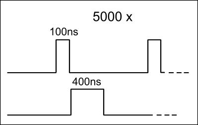 100ns entspricht einem Cycle bei 10Mhz Takt. Mit einem Mini Atmel ATtiny für 1 Euro lässt sich das einfach erledigen. Nehmen wir an die Leitung 1 sei PortB0 und Leitung 2 sei PortB1 dann setzt du den PortB auf 0x01 und im nächsten Schritt auf 0x02 dann drei nop und den PortB auf 0x00 zurücksetzen. das ganze in einer Schleife 5036 mal und in der Schleife die restliche Zeit der 2400ns durch eine weitere kleine Schleife oder nop verbraten. Fertig. .define tmp = R16 .define zero = R17 .define one = R18 .define two = R19 ; Variablen initialisieren ldi null, 0x00 ldi one, 0x01 ldi two, 0x02 ; Ports initialisieren out PORTB, zero ; PortB initialisieren ldi tmp, 0x03 out DDRB, tmp ; PortB0+1 sind Ausgänge ; schleife 5036mal, -5036 ist in hex 0xEC54 ldi R25, 0xEC ldi R24, 0x54 loop: ldi PortB, one ldi PortB, two nop nop nop ldi PortB, zero ; 600 von 2400 ns sind nun verbraten nop ; Die Schleifa am Schluss braucht noch 4 cycles nop ; also noch 1400ns durch 14 nops verbraten nop nop nop nop nop nop nop nop nop nop nop nop addiw R24, 0x01 ; 16-bit Schleifenzähler erhöhen brne loop ; schon 5036 mal durch ? fertig: rjmp fertig So, wirklich fertig, viel Spass und ciao Remo