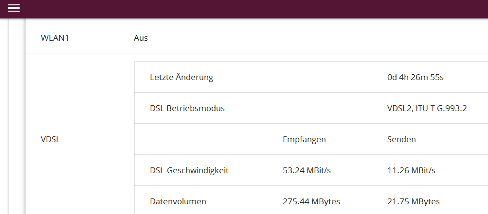Manfred P. schrieb: > Nein, siehe Anhang - 50Mbit/s Und, was soll das bitte beweisen, dass du eine Bintec Kiste hast? ;-) Siehe meine beiden Screenshots, einer aus 11/22 mit einer FB 7390 u. der andere aus gerade eben mit dem SL-5501. Es soll wohl auch welche mit 25 MBit geben. Manfred P. schrieb: > Vectoring kann hier nicht sein, weil Telekom und htp auf dem selben > Kabel liegen. Tja, dann habt ihr die A-Karte gezogen, lt. der techn. Quelle da oben habt ihr ja noch das uralte VDSL nach ITU 993.2 ohne Vectoring mit Profil 8B , dann bekommt aber Keiner mehr als 50 MBit bei euch. Eine seltene Ausnahme von der Regel. Reinhard S. schrieb: > Es ging um die Bandbreite aka Frequenzbereich, nicht die > Datenübertragungsrate... Ach nee, schon wieder rausreden, entweder Bandplan oder techn. Norm, ITU .. Und wem willst du hier was mit f-Bereich verklickern, darüber hat hier noch niemand geredet, das sind böhmische Dörfer. Reinhard S. schrieb: >> VDSL geht bei ca. 23 MBit los u. wird lt. Anzeigen im DSL-Modem an den >> VDSL-Light-Anschlüssen immer mit Vectoring betrieben, > > Ausnahmen bestätigen die Regel. Nö, neue Standards die noch Keiner kennt. Der Michael aus BB oder MV war der Erste damit voriges Jahr. Reinhard S. schrieb: >> Um beim Thema des TO zu bleiben, würde ja nach deiner Aussage ein Modem >> ohne Vectoring reichen? > > Die 7312 vom TO kann nur ADSL(2+), daher würd ich in dem Punkt nicht die > Hand ins Feuer legen. Mit einem VDSL-tauglichen Gerät sollte zumindest > eine Verbindung zustande kommen. Das war der Grund der Mitteilung vom ISP, laienverständlich ausgedrückt, wo aber Manche hier rumgemunkelt haben mit GF. Warten wir es einfach ab.