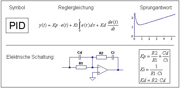Hermann W. schrieb: > Wie sieht denn bei euch ein idealer PID-Regler aus? Das habt ihr doch > sicher als erstes gelernt. Auf die Darstellung müßt ihr G2 anpassen. > Dass R0*C0 für den I-Anteil zuständig ist, sieht man eigentlich mit > etwas Erfahrung auf den ersten Blick, das kann man überall nachlesen. > Und für den D-Anteil mit C1*R1 gilt das gleiche. R2 ist nur für die > Realität zuständig, weil es real keinen idealen D-Anteil gibt. Wenn R2=0 > ist, fällt die parasitäre Verzögerung weg. Beim idealen PID war das ganze einfacher (auch mit der Herleitung der Formel, die Schaltung ist gleich nur R2 eben 0). Da ist Kd = C1*R0, Ki = 1/(C0*R1) und Kp = (C0*R0+C1*R1)/(C0*R1). Tn = Kp/Ki und Tv = Kd/Kp. Aber R2 macht eben vieles schwerer und führt mich eben zu der anderen Formelaufteilung mit TR1, TR2 und TP(?). Und ich weiß eben auch nicht, ob die "einfachen" Formeln in diesem Fall auch gültig sind.
