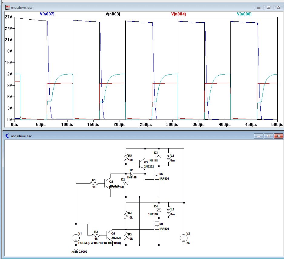 Nun, rot und cyan sind die Gate-Steuerspannungen und Schwarz und Blau die Drainspannung am MOSFET.
