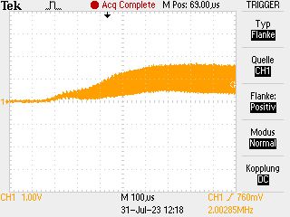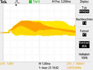 Bei Board #1 ändert eine unsymmetrische Beschaltung (C4 = 68pF) nichts prizipielles (An- und Abschwellen der Frequenz schaut halt ein bißchen anders aus), bei den Boards #2 und #3 (noch mit den ursprünglichen Quarzen) stellt sich nun ein stabile Freqenz ein (siehe vorher und nachher mit 68pF), allerdings nicht die korrekte mit 8MHz, sondern eine etwas unterhalb von 4MHz.