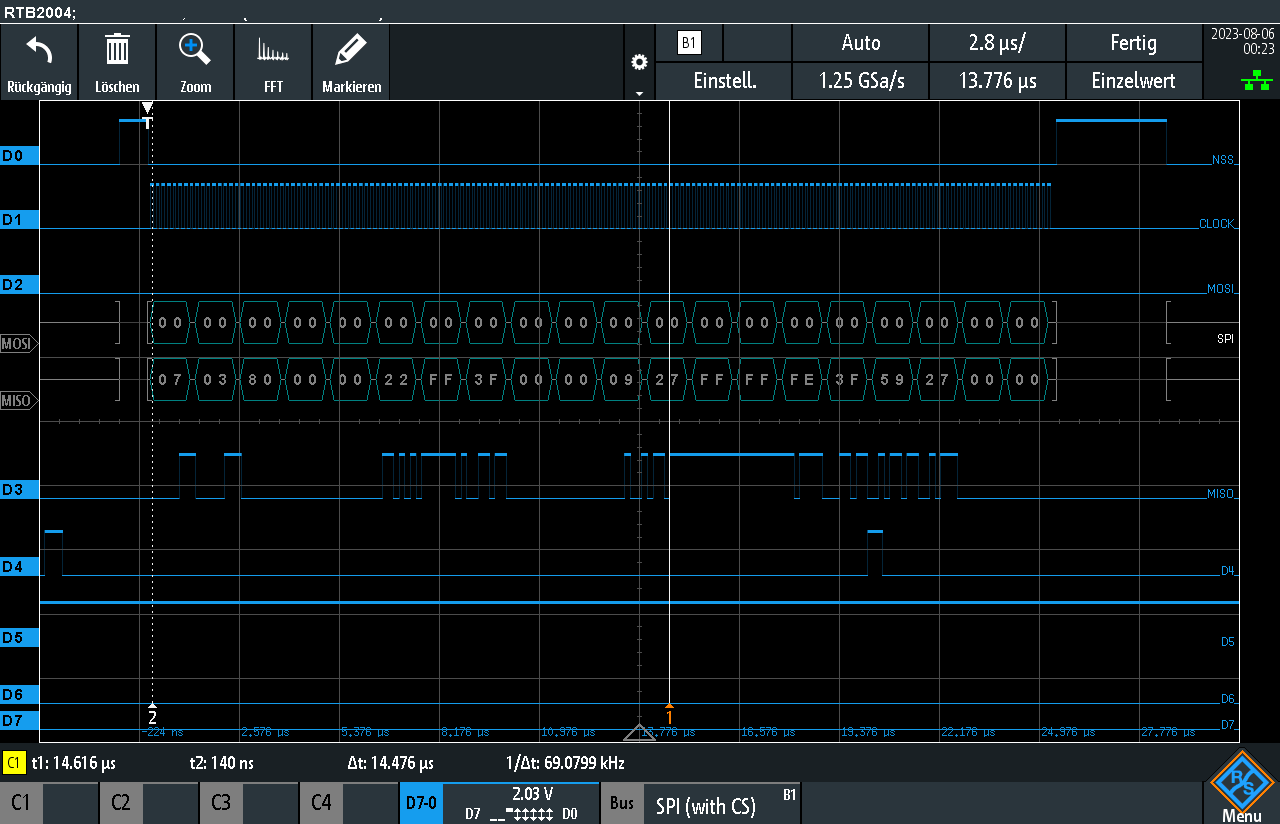 Sheldon G. schrieb: > @Hans-Georg L. > > Aber bist Du Dir sicher, dass auch der H745 das NSS "richtig" ansteuert, > d.h. Vor dem Transfer NSS=>0, dann mehrere Bytes übertragen und > anschließend wieder NSS=>1. > Ich verwende Das h743Zi(T6U) Nucleo Board mit einem AS6501 und da funkioniert das NSS siehe Anhang. Kanal 2 ist der Interrupt Kanal 3 das NSS Signal und Kanal 4 die eingehenden Daten. Die verwaschene Flanke am Ende der Übertragung bekommt man weg wenn man den Pin vorher zusätzlich auf Ausgang und auf 0 setzt. Er schaltet am Ende scheinbar das NSS einfach ab und nicht aktiv nach 0 und wenn dann der Pin auf Eingang steht machen sich die internen Kapazitäten bemerkbar. Wenn du alles auf einmal lesen willst musst du aber 32 Bit lesen . 24 Bit liest er 16 + 8 Bit in 2 Sequenzen.