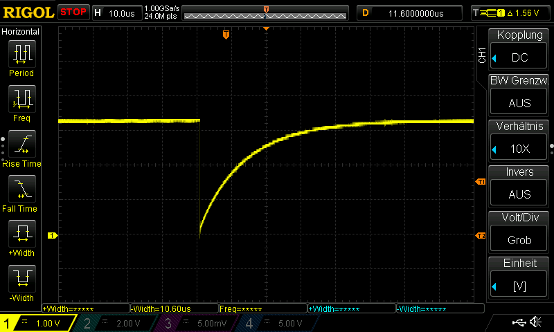 Hallo, ich habe ein IC welches ich über einen i2c Í/O Expander ansteuere, welches ein nSleep Pin hat. Wenn ich den Pin über den I/O Expander (P1) auf Low ziehe, ist das IC im Sleepmodus und auf High im Normalmodus, soweit alles gut. Der Sleep Pin hat noch eine zweite Funktion und zwar ein internen Reset, wenn der Sleep Pin für 5-20µs auf Low gezogen wird (in den Sleep geht er erst nach min. 40-120µs) Leider dauert ein Pegelwechsel über den i2c Bus min. 100µs und ist somit dafür unbrauchbar. Deshalb habe ich es mit einem RC-Glied versucht und einen 10n Kondensator an P2 des Expanders angeschlossen, siehe vereinfachten Schaltplan. Schalte ich jetzt P2 am Expander auf Low (P1 bleibt High) wird ein Impuls generiert, aber leider führt das IC danach keinen Reset aus. S. Foto Die Zeiten passen lt. Oszi und ich habe auch verschiedene Widerstände von 560-2,2K probiert, leider alle ohne Erfolg. Ich vermute das die zu langsam ansteigende Flanke das Problem ist und das IC deshalb keinen Reset auslöst. Jemand ne Idee wie ich das lösen kann? Am liebsten mit nur wenig passiven Bauteilen... Gruß Markus