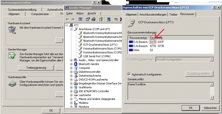 Ansonsten mal im Geraetemanager schauen, was bei dir an der rot markierten Stelle steht. Dieser Wert muss in den Bascom Einstellungen bei "LPT-address" rein. So wie auf dem Bild sollte es bei den meisten aussehen, aber bei dir koennte u.U. irgendein exotischer Wert dastehen. Beste Gruesse