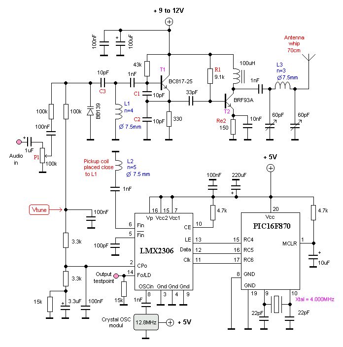 Hallo Ich habe den LC-Tank des VCO (siehe Schema) so geändert, dass er im 2m Amateurband schwingt (ich habe eine Klasse A Amateurfunk Lizenz). Ich habe dafür eine PLL-Schaltung gebaut, die zusammen mit dem VCO funktioniert. Nun wollte ich den eher mageren Pegel mit einer Verstärkerschaltung der Klasse A von ca. -9dBm um ca. 20dB verstärken. Dafür habe ich die Tiefpassfilterstufe (L2, L3, C12) entfernt. Doch die angehängte Verstärkerschaltung (siehe zweites Bild) funktioniert nicht. Hat jemand ne Ahnung, was ich ändern muss? (Die Verstärkerstufe hängt direkt am Kollektor von Q1) Hier noch den Link zur Verstärkerstufe: [[https://www.analogictips.com/vhf-class-a-amplifier-design/]]