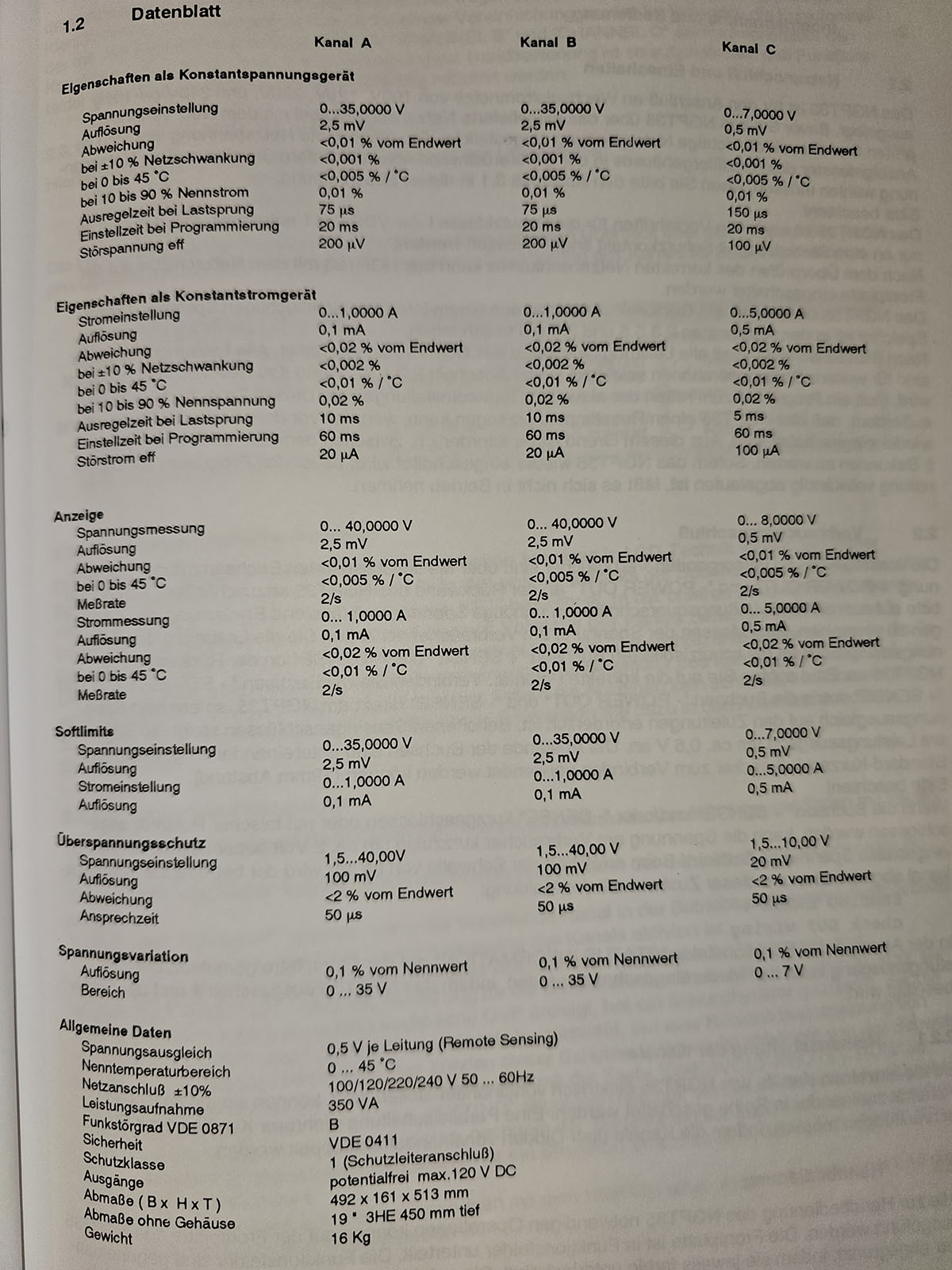 Habe noch das Datenblatt angehängt. Mein Gerät hat allerdings 7V/5A auf Kanal A+B und 18V/2A auf Kanal C. Manfred P. schrieb: > Dann pfusche nicht an der Kalibrierung herum, sondern suche den Fehler, > das defekte Bauteil. Gepfuscht wird nix, zumal sich die Kalibrierdaten einfach sichern und wiederherstellen lassen. Dass ein Fehler vorliegt, halte ich für unwahrscheinlich, da es sich um ein NOS Gerät handelt (unbenutzte Lagerware), was man beim Kauf auch ganz klar sehen konnte (Originalkarton, Gerät komplett unversehrt). Dass dieses Flackern beim Aufwärmen des Geräts verschwindet, deutet für mich auf die Kalibrierung hin.