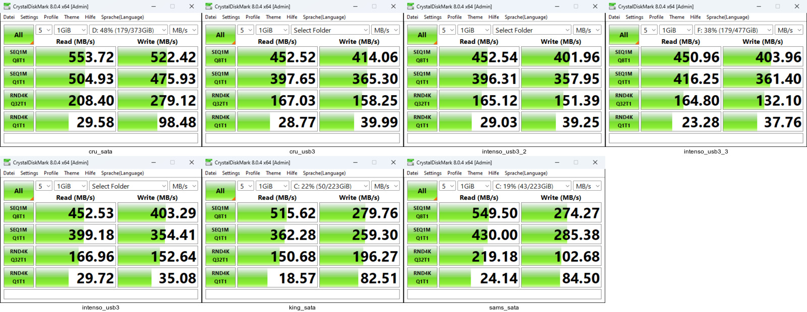 Beim Thema Lesen haben übrigens keine der Platten ein Problem, Befehl: sudo dd if=/dev/sdX of=/dev/null bs=64M status=progress (Vorsicht!) 450 MB/s durchgehend für Kingston sata6g und Intenso usb3, Samsung sata6g 566 MB/s