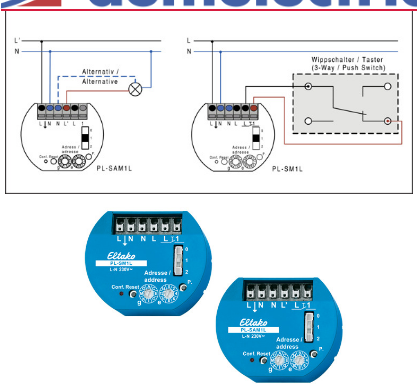 Keine Gewähr habs überflogen Gibt auch von Eltako Powerline Sachen, auch sehr basic möglich Im screenshot ein Sensormodul plus Schalter und ein Aktormodul plus Glühlampe Beispiel Zitat aus Katalog "Für die Adresszuweisung befi nden sich auf der Vorderseite zwei Drehschalter: Der linke Drehschalter bestimmt die Gruppenadresse g mit 16 alphabetischen Werten von A bis P. Der rechte Drehschalter bestimmt die Elementadresse e mit 16 numerischen Werten von 0 bis 15. Oberhalb davon befi ndet sich ein Schiebeschalter als Konfi gurationsschalter mit den Stellungen 0, 1 und 2. Stellung 0: Sensoreingang wirkt als Taster (Stromstoßschalter). Stellung 1: Sensoreingang wirkt als Schließer (Relais). Stellung 2: Ein Wechselschalter wird wie ein Taster ausgewertet. " Katalog https://www.eltako.com/fileadmin/downloads/de/Prospekte/Powerline-Prospekt_dt_lowRes.pdf Screenshot quelle https://www.demelectric.ch/produkt/starter-kit-pl-no-1-eb-powerline-aktor-pl-sam1l-mit-eb-powerline-sensor-pl-sm1l/