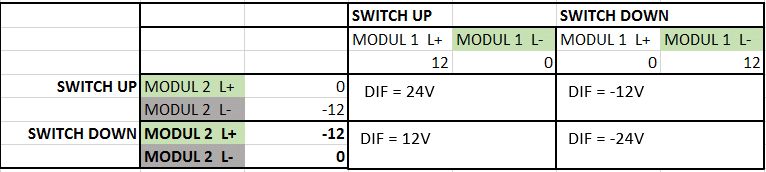 Achim M. schrieb: > Beide Male erhältst du die gleiche Polarität Die Spannungsrichtung ist doch konform und müsste sich addieren. Die Ausgänge sind jeweils über Induktivitäten getrennt. Ich dachte, dass die dann unabhängig voneinander werden ... Hier ist die Wahrheitstabelle. Achim M. schrieb: > Der Lautsprecher, den du mit > doppelter Spannung bedienen willst, wird hierbei den vierfachen Strom > ziehen. Eigentlich geht es nur um die Aufteilung der Leistung. Die Zielspannung bleibt die gleiche. Nur eben über 2 Moduleinheiten.