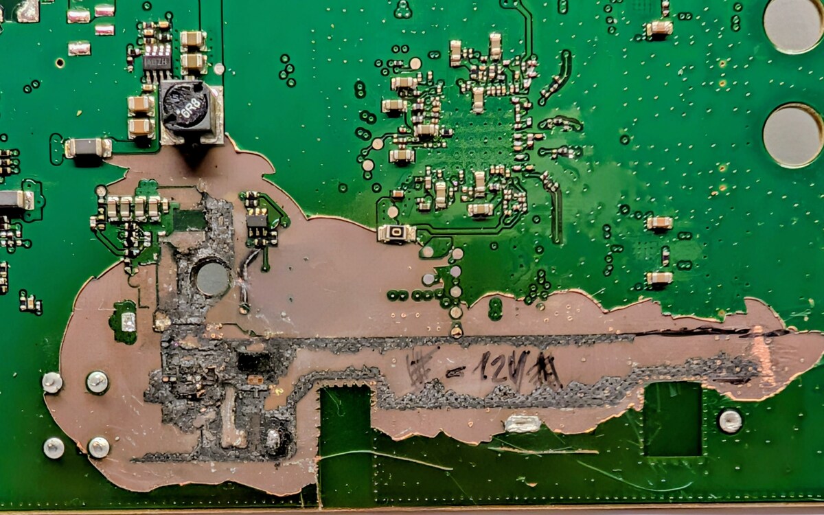 das Bild ist von der c't https://www.heise.de/hintergrund/Routerdefekte-durch-falsche-Kondensatoren-auch-bei-Fritzbox-6890-LTE-11086055.html an dem Loch kommt das 1.Prepreg zum Vorschein, das durch die 12V-Plane (Innenlage) geschmort hat; man sieht die Brandstellen an den CU-freien Stellen - wie auch rechts an dem kleinen IC 1B = BC857D