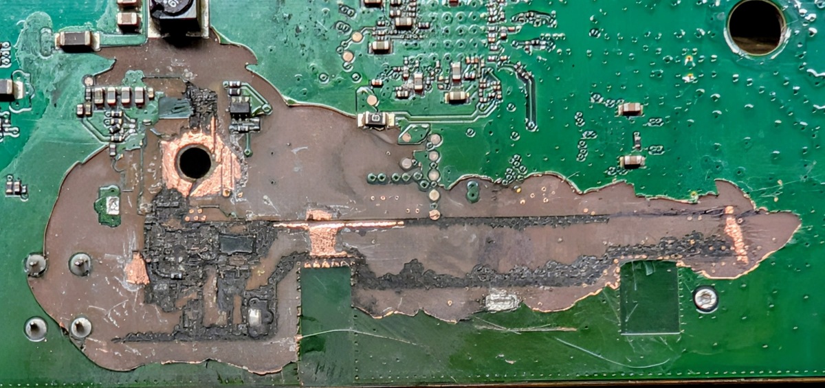 Vanye R. schrieb: > So sieht > es aber so aus als wenn die Platine selber einen Restwiderstand hat Schau dir das doch mal an. - Das schwarze Zeug befindet sich zwischen GND-Fläche und +12V Leiterbahn. - Man sieht da eine Ferritperle, so ein 1206 Bauelement welches nicht mal warm geworden ist, aber drumherum ist alles wie wild verbrannt. - Bei dem Bohrloch frage ich mich auch wo und wie der Strom da fließen soll. Das sieht für mich nach Flüssigkeit aus die sich auf der Platine verteilt hat. Das Gerät hing nicht an der Wand, sondern stand auf einen Tisch und irgend jemand hat zufällig beim Blumen gießen oder mit einem Getränk einen Tropfen rüber geschüttet.