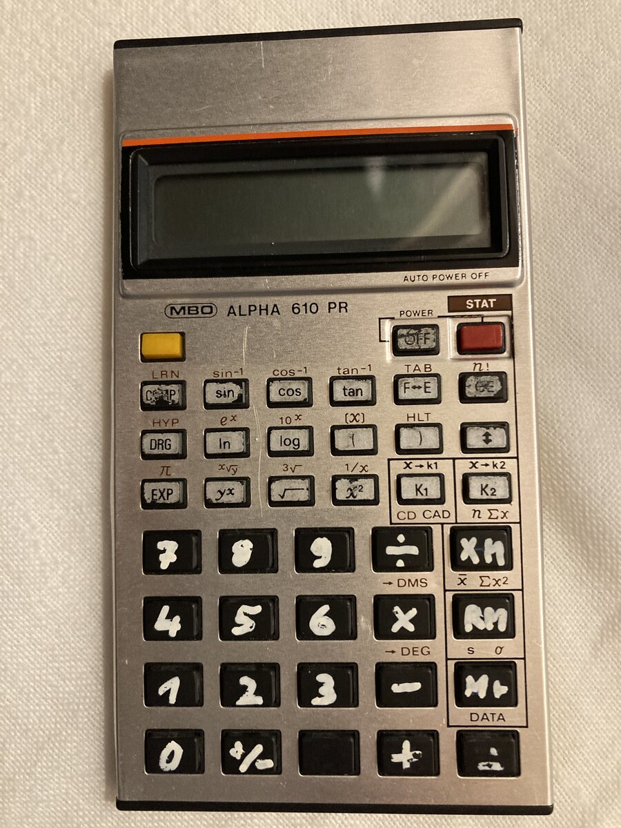Manfred P. schrieb: > Welchen Sharp? Der oben links lässt einen ganz normalen EL-506 vermuten, > den ich noch heute benutze. Dieser hört bei mir auf den Namen „MBO Alpha 610PR“. Habe ich gebraucht aus‘m Westen bekommen als ich für die BS einen erbettelt habe. Ist mittlerweile total ausgeklappert, Tastenbeschriftung abgefingert. Müssten Batterien rein, ging beim letzten Mal noch.