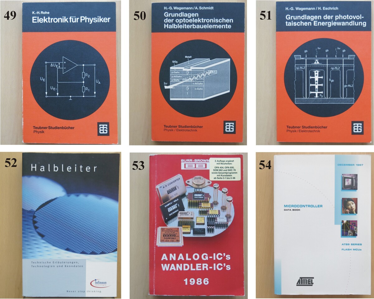 Hallo zusammen, ich möchte die folgenden Lehr- und Fachbücher anbieten: 49 K.-H. Rohe_Elektronik für Physiker, 2. Auflage, 1983, 248 Seiten, 290g, 3€ 50 H.-G. Wagemann, A. Schmidt_Grundlagen der optoelektronischen Halbleiterbauelemente, 1998, 244 Seiten, 295g, 3€ 51 H.-G. Wagemann, H. Eschrich_Grundlagen der Photovoltaischen Energiewandlung, 1994, 144 Seiten, 190g, 2€ 52 Infineon_Halbleiter. Technische Erläuterungen, Technologien und Kenndaten, 3. Auflage, 2004, 618 Seiten, 900g, 5€ 53 Burr-Brown_Analoge IC’s, Wandler IC’s, 2. Auflage, 1986, ca. 500 Seiten, 640g, 3€ 54 Atmel_Microcontroller Data Book, 1997, ca. 500Seiten, 630g, 3€ Zustand der Bücher: sehr gut. Zzgl. Versandkosten je nach Gewicht. Bei Abnahme aller Bücher übernehme ich die Portokosten (innerhalb Deutschlands). Bei Interesse bitte direkt an meine Adresse k_seibel(at)mail(dot)ru melden. VG Konstantin