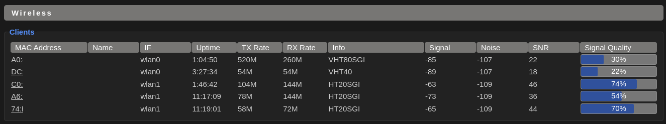 Rüdiger B. schrieb: > Ich benutze auf meinem PC den Vistumbler zur grafischen Darstellung der > Feldstärke. Ich brauche aber nicht die Feldstärke der verschiedenen APs, sondern eines einzigen Clients in meinem WLAN-Netz. Identifiziert entweder durch MAC oder IP.