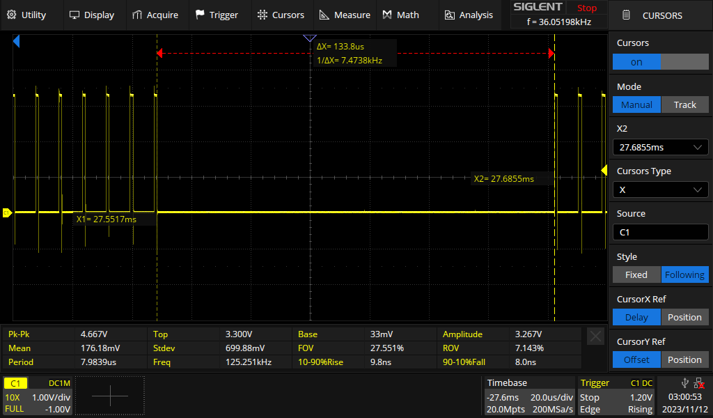 1 Impuls = 1 µS + 7 µS Pause (=125 kHz)